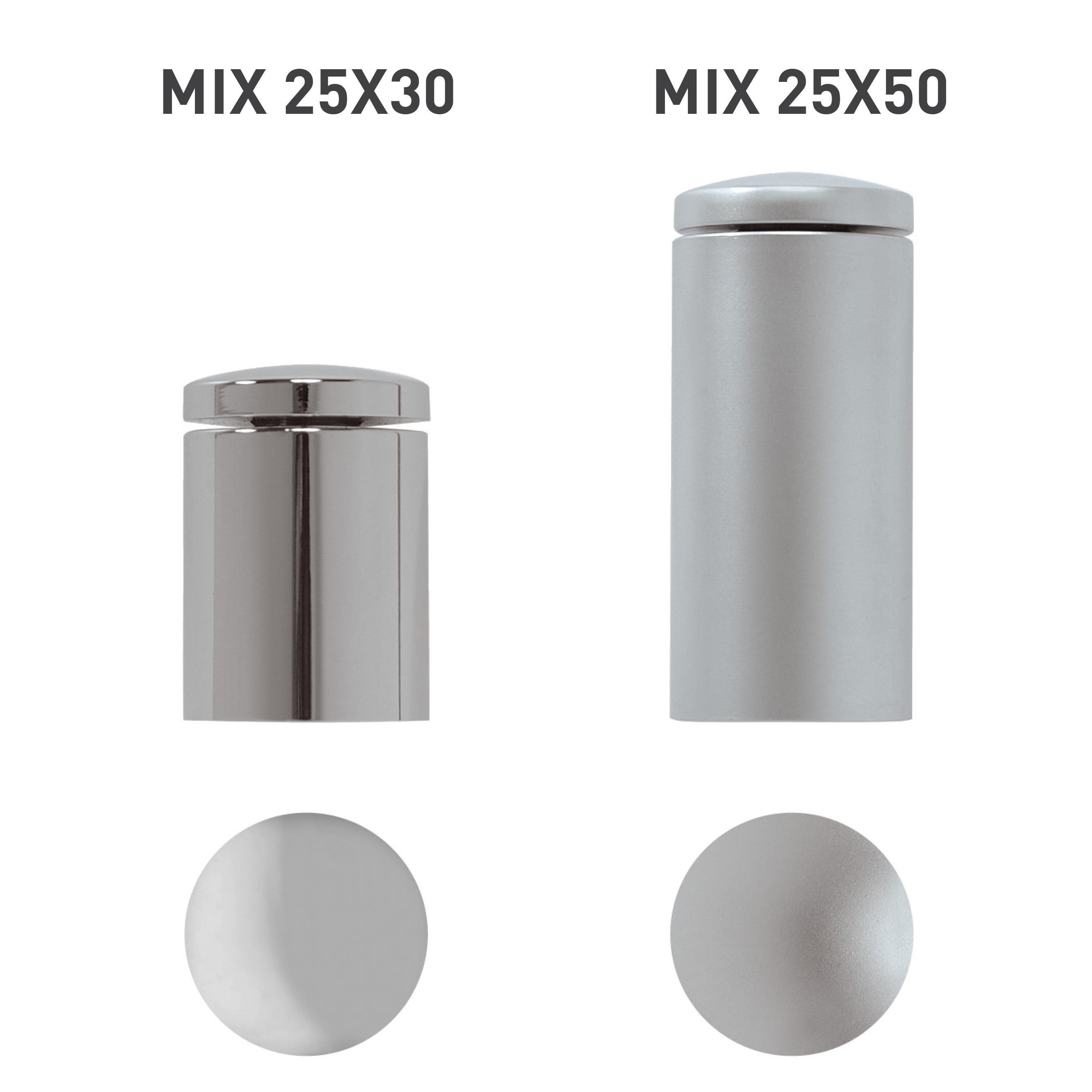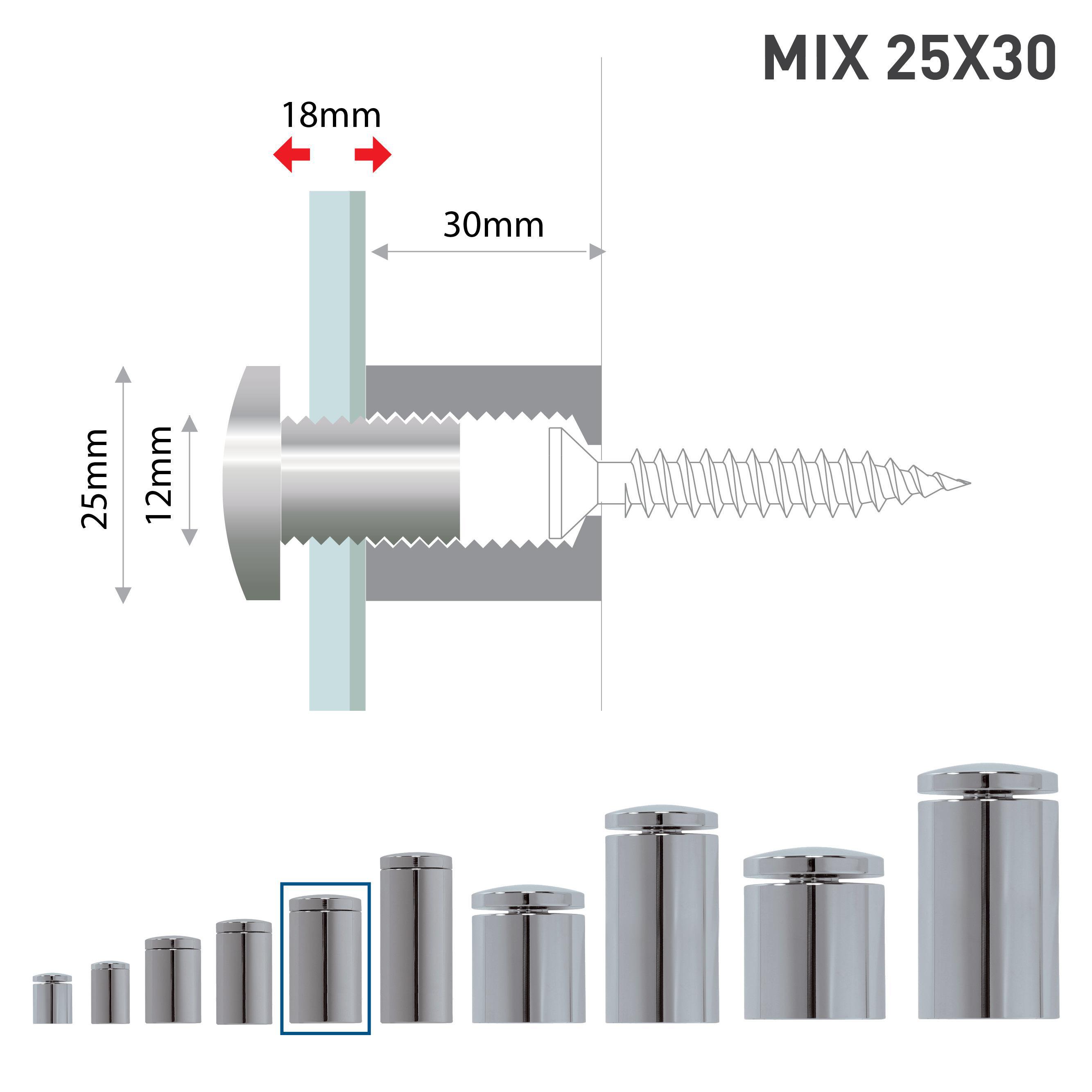 Il sistema di fissaggio a vite offre un'ampia gamma di opzioni. Il sistema Fisso Mix rappresenta la soluzione più pratica per il fissaggio di lastre in spazi di difficile accesso, come nicchie o angoli interni. Per utilizzare il distanziale, è sufficiente fissarlo alla parete, posizionare il pannello, inserire la testina nel foro attraverso il pannello e avvitarla per completare l'installazione. Nella tabella accanto, sono disponibili tutti i distanziali con le relative informazioni su spessore, distanza dalla parete e colorazione. Modalità di fissaggio: sistema a vite con montaggio frontale. Materiale: ottone con finitura cromata. Dati tecnici: Ø25mm, distanza dalla parete: 30mm o 50mm.